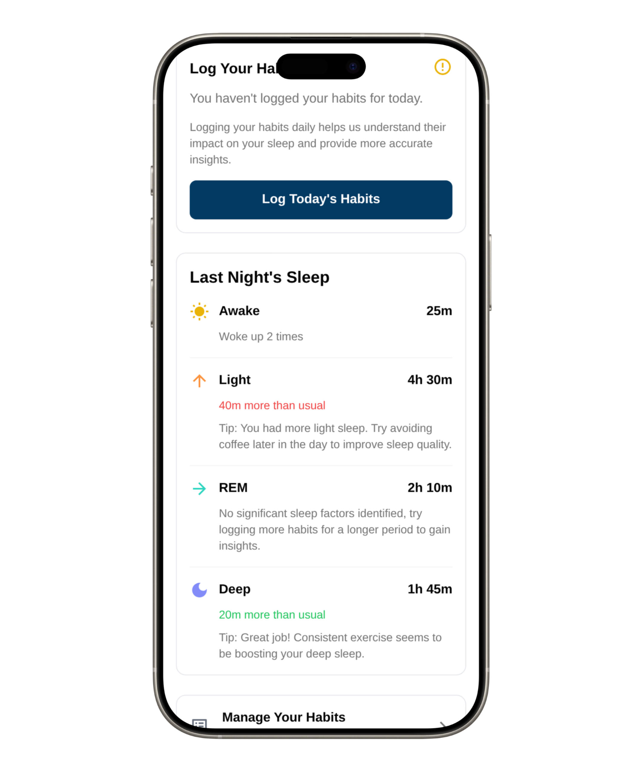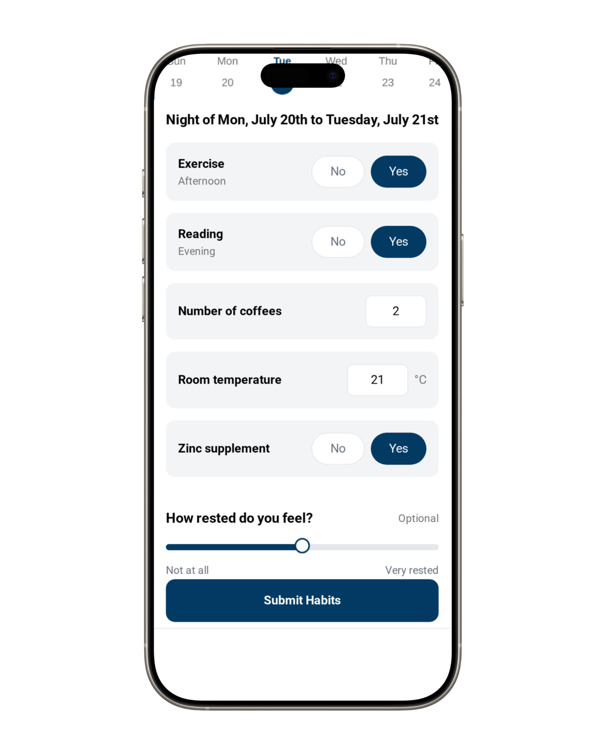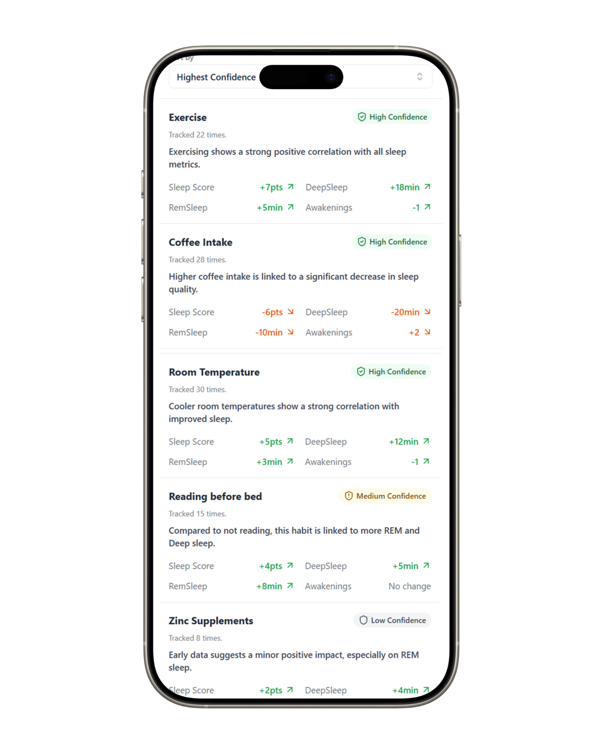 Take 30 seconds each day to log the factors you believe affect your sleep. Track anything from your afternoon coffee to your evening workout with our simple, intuitive interface.